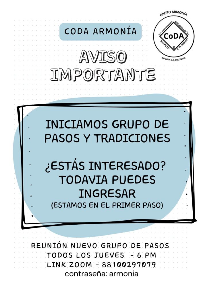 Bienvenidos a CoDA. El único requisito para ser miembro de CoDA es desear relaciones sanas y amorosas. Reconozco en mí un nuevo amor y una nueva aceptación de mí mismo y de los otros. Me siento genuinamente merecedor de ser amado, amoroso y amable.